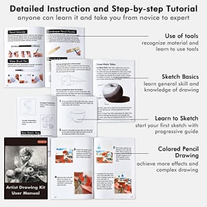 • STEP-BY-STEP DRAWING TUTORIAL: Comes with a useful booklet, which contains detailed instructions of each tool, general skill and knowledge for drawings, and step-by-step drawing tutorials to help you get started with your first step in the art world. Start creating your masterpiece now or take your art into an advanced level, this drawing kit will bring you a great progress in your art journey.