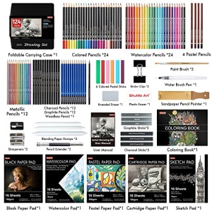 • PROFESSIONAL DRAWING KIT: Shuttle Art 124 pack drawing pencils set includes 24 colored pencils, 24 watercolor pencils, 12 metallic colored pencils, 12 graphite pencils, 12 charcoal pencils, 4 pastel pencils, 1 woodless graphite pencil, 3 charcoal sticks, 3 graphite sticks, 6 colored pastel sticks and versatile drawing tools and paper pads, perfect for creating art works with coloring, drawing, sketching and more.