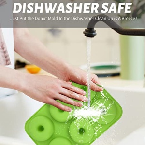 • EASY TO USE & EASY TO CLEAN: It is important to Spray with little Oil before using them and fill the batter carefully. Then simply place the molds on a cookie sheet .Easy to be removed as you can just pop the bottom of the mold up and slide the donut off the extended center. Time saving and quick release. Nothing will stuck. No costing ,safer than aluminum baking pans. After using ,clean by hand with some warm water or Dishwasher Safe .