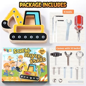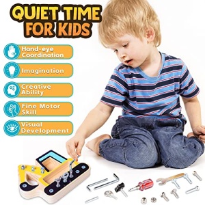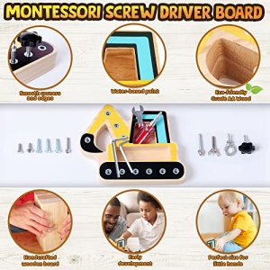 • 🚚【 HIGH-QUALITY TOY WITH NON-TOXIC MATERIAL】Everything included is made up of high quality and with the safest and non-toxic material to make sure your child spends their time longer and much safer. Our screwdriver board is made of safe wood with a curved edge design without any sharp edges. Smooth corners and surfaces make it comfortable to play with tiny hands and ensure safety at maximum.