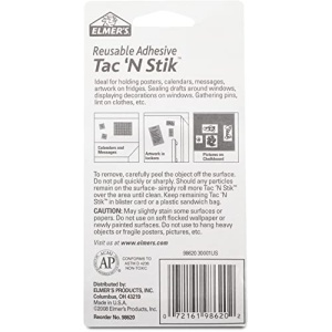 Hang maps, posters, paper decorations, and other lightweight items with Elmer’s Tac ‘N Stik Reusable Adhesive. The multi-purpose, colorless adhesive putty stays moist after application and is designed to be removed and reused for commitment-free decorating. Elmer’s Tac ‘N Stik is non-toxic and works best on doors, walls, refrigerators, and other non-porous surfaces. The easy-to-use formula replaces tacks and tape for great hanging results.