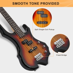 - ♫【BURING FLAME SHAPED】- This electric bass guitar has an attractive flame shape looks like buring fire made of solid basswood. The fretboard material is rosewood, and neck is made of maple, these can ensure your tone stability and smooth.