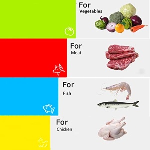- COLOR CODED: Four assorted colors on the cutting board mats help you to finish different meals. The pictures on each one could be identifying which one to use based on what choice of food being chopped. Each mat has an printed illustration of the item to use them for: meat-fish-vegetables. No guessing what you used these last to cut.
