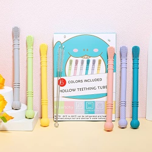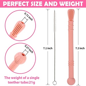 - 【EASY TO CLEAN】Our teether tubes are hollow, and we’ve included 2 cleaning brushes for easy cleaning. The teething tube is resistant to high temperatures and low temperatures, so it can also be washed in the dishwasher.