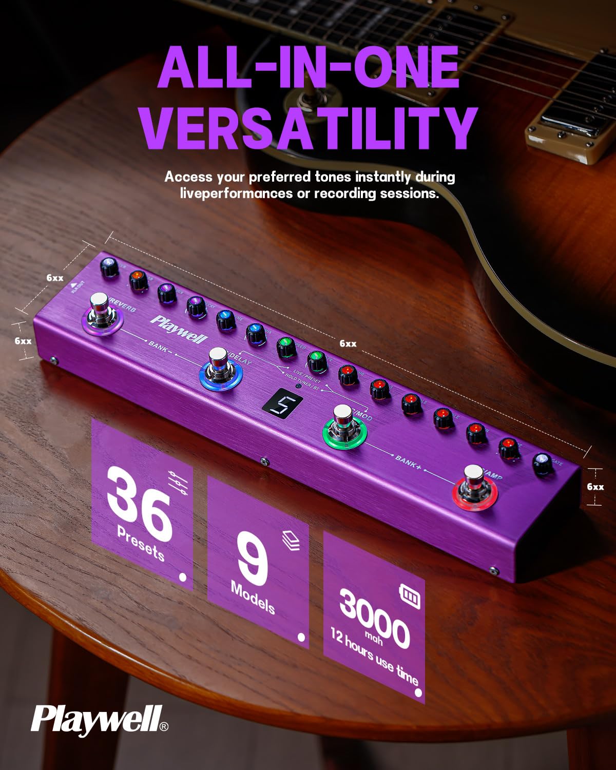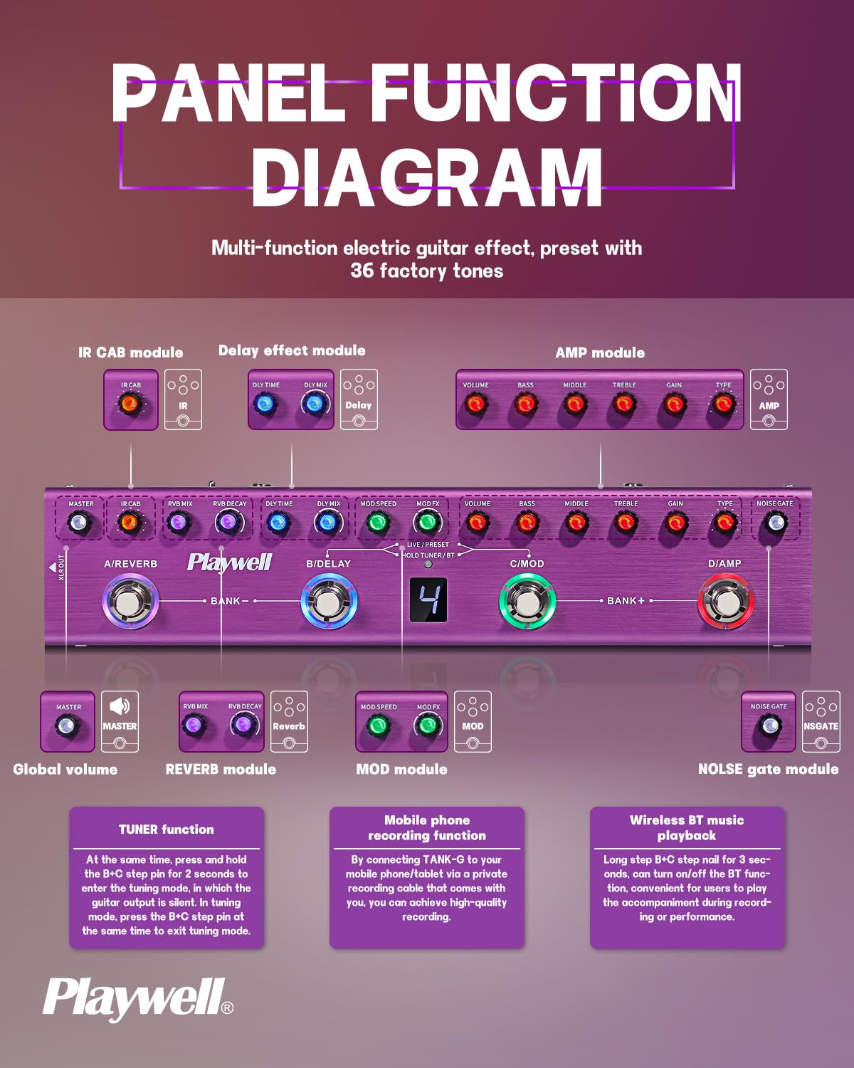 Playwell Multi Effects Guitar Pedal TANK-G,Digital Electric Guitar Effector with 36 Editable Presets,Chorus,Delay,Reverb,MOD,IR Loading,Recording,Tuner,Built-in battery,BT connection