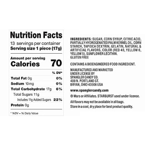 • Ingredients: Sugar, Corn Syrup, Citric Acid, Partially Hydrogenated Palm Kernel Oil, Corn Starch, Tapioca dextrin, Gelatin, Natural and Artificial Flavors, Color (Red 40, Yellow 6, Yellow5), Sunflower Lecithin.