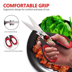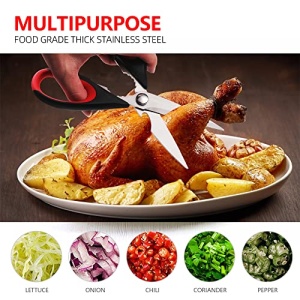 - [STAINLESS STEEL SHARP BLADES]: high quality hardened stainless steel blades easily cut through cardboard, twine, food, meat, vegetables, chicken, poultry, fish, herbs, seafood, BBQ, food packing bags and more. Great as Food Scissors, Meat Scissors, Cooking Scissors, Scissors Kitchen, Cooking Shears, Poultry Scissors, Utility Scissors, Meat Cutting Scissors.