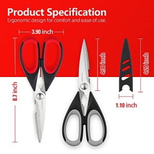 - [TWO PACKS]:Includes 2 Pack of 8.2 inches kitchen scissors,black red, black gray. Different color handles can be used in different places,2 special scissors are suitable for most items that need to be cut. for best results, do not allow shears to soak in water and always dry thoroughly promptly after washing.