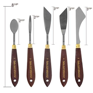 - A 5-piece premium quality stainless steel artist palette knife set with sturdy comfort-grip wooden handles. The handles have holes for hanging them.